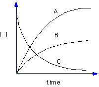 Each of the following curves corresponds to one of the species in the reaction shown above. Which curve represents the time dependence of the concentration of O2?