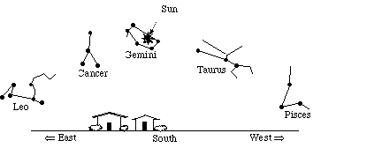 10. If you could see stars during the day, this is what the sky would look like at noon on a given day. The Sun is near the stars of the constellation Gemini. Near which constellation would you expect the Sun to be located at sunset?